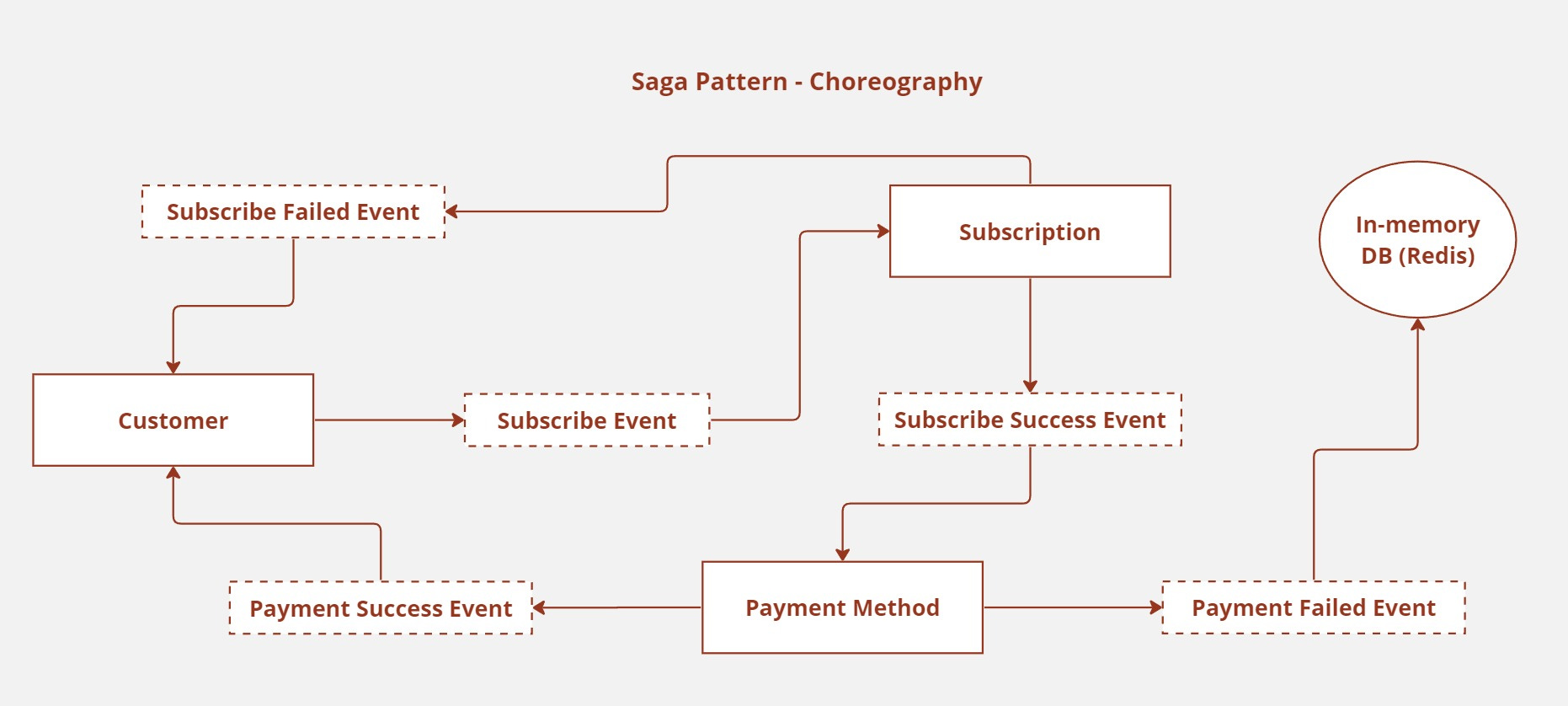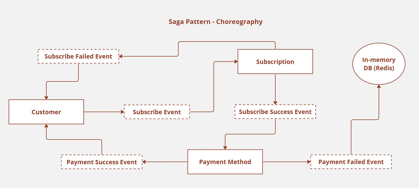 Compensation must be triggered in the event that any of the phases fail. For instance, in the event that the card information is not successfully saved to the Payment Method service, the payload may be temporarily stored in an in-memory database for future attempts, or the subscription payment may be fully reverted, resulting in a refund to the consumer.