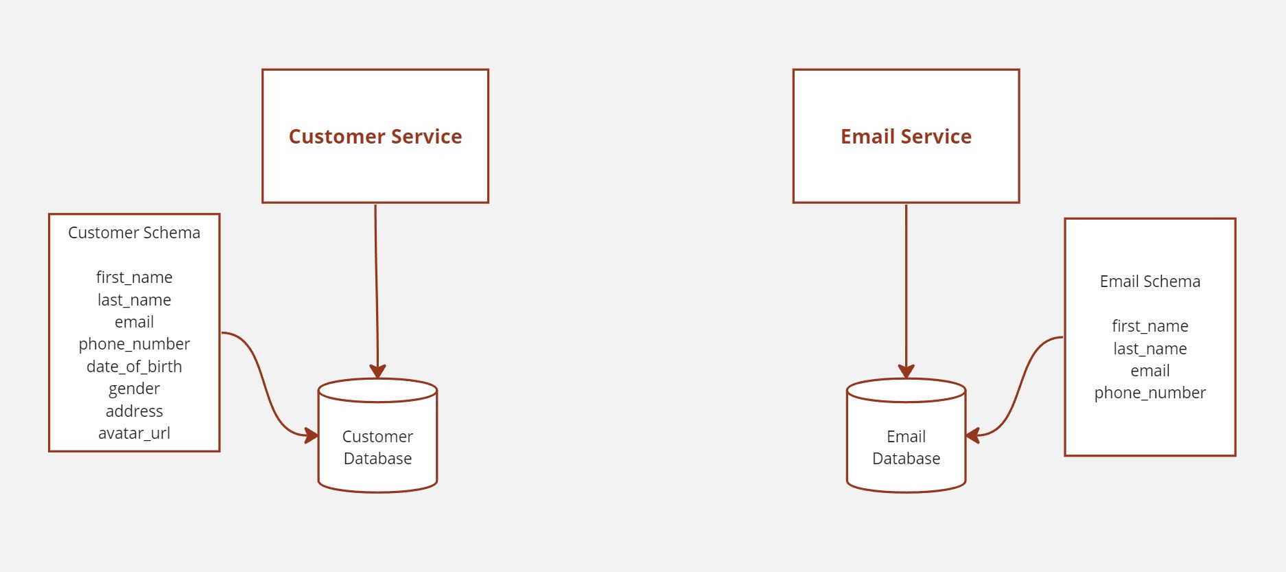 The application is made in such a way that customer service retains client credentials and sends certain customer credentials to the email service for data redundancy. Essentially, the email service uses a customer table that collects the first name