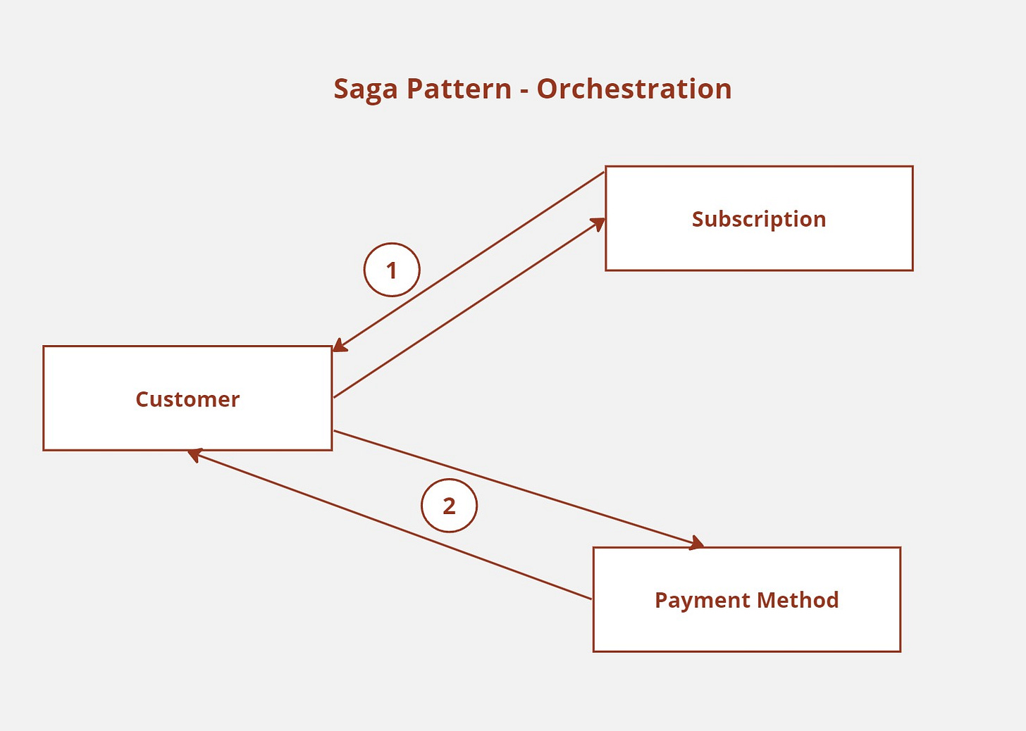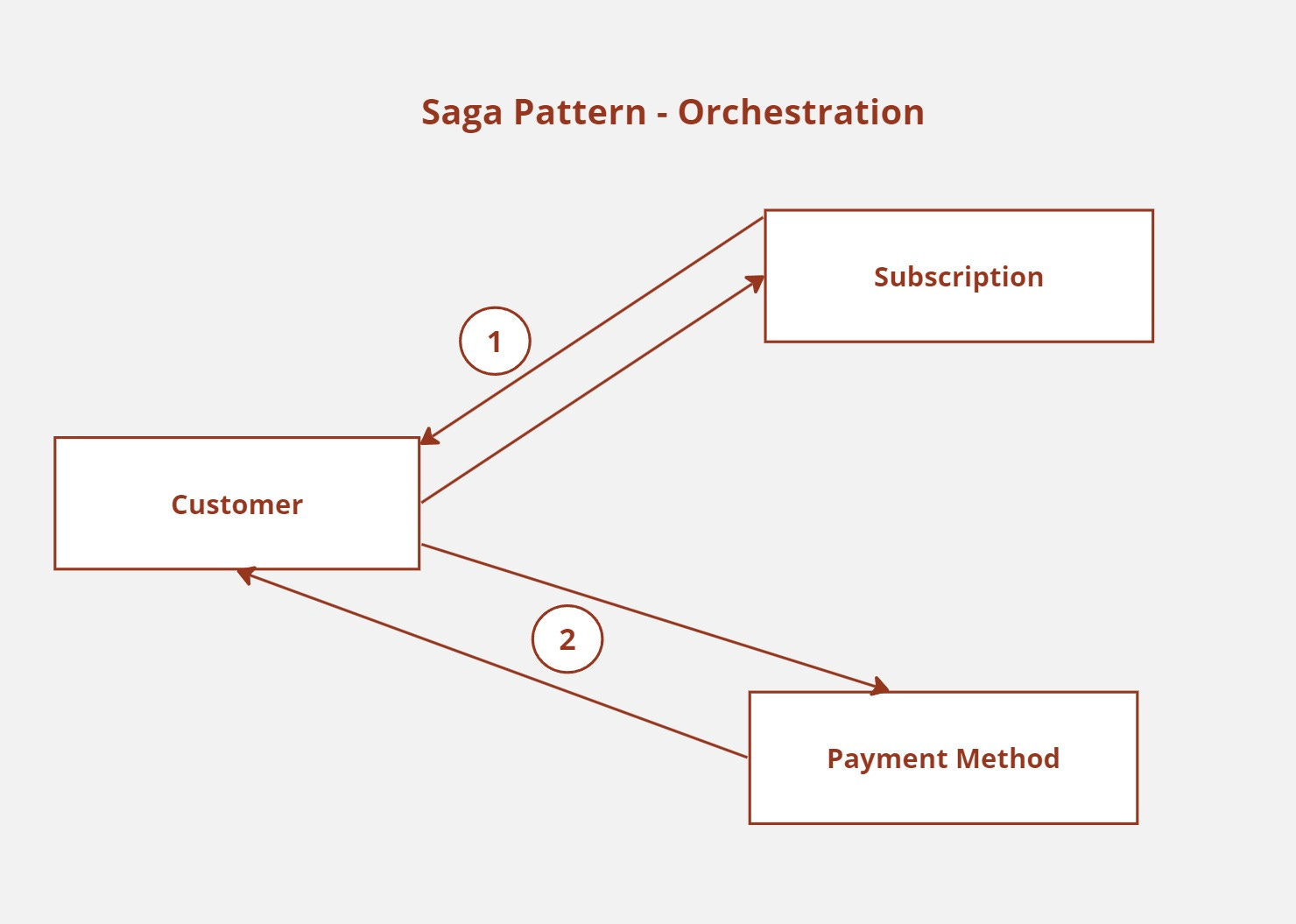 The transaction will appear in an orchestrated saga pattern, as seen in the diagram above. Customer service will take on the role of conductor in this instance. When a user clicks the Upgrade to Premium