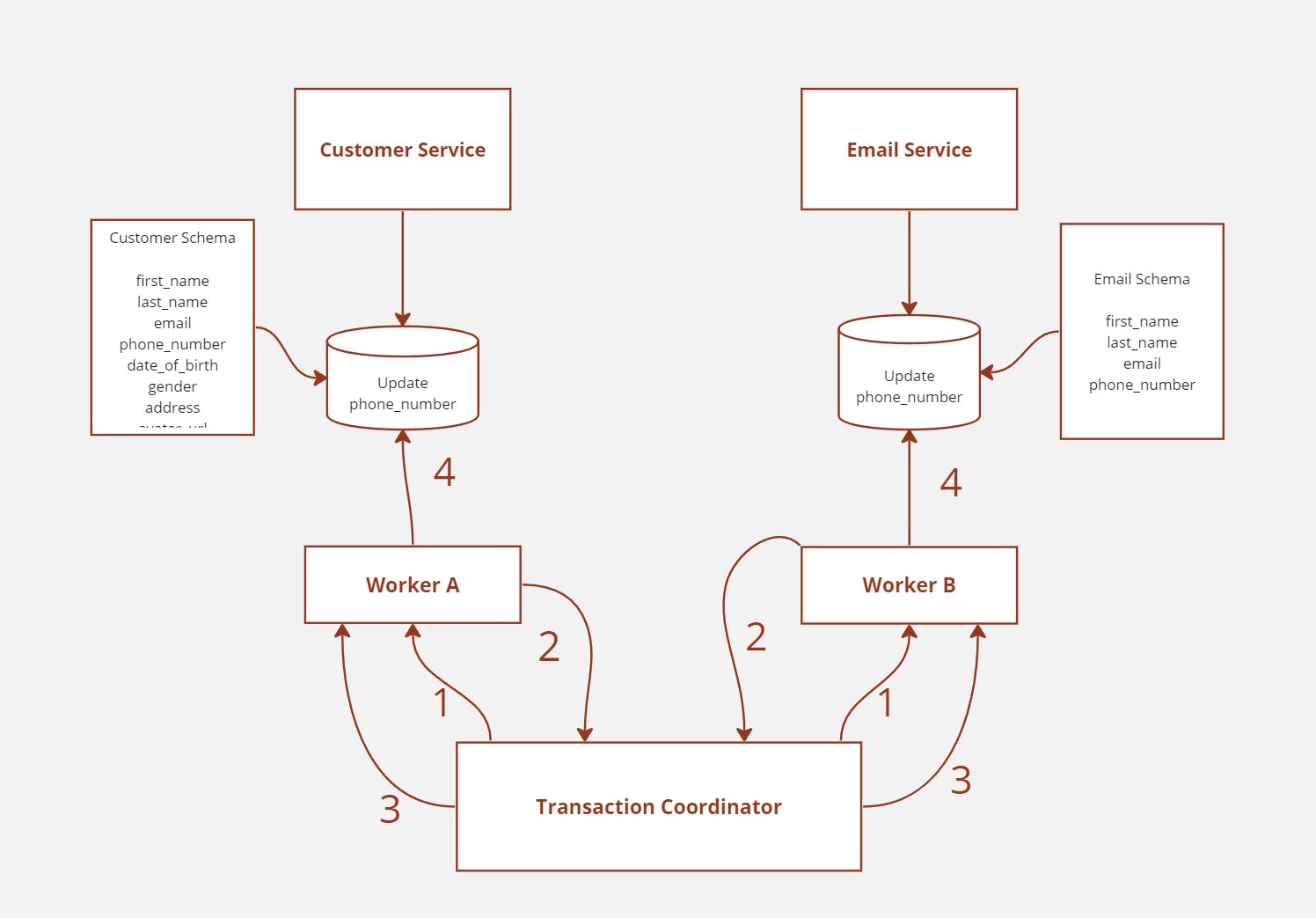 This case perfectly illustrates the challenges associated with managing a distributed transaction: how can we make sure that, when the customer table in the customer service is updated, the customer table in the email service is updated in a corresponding way?